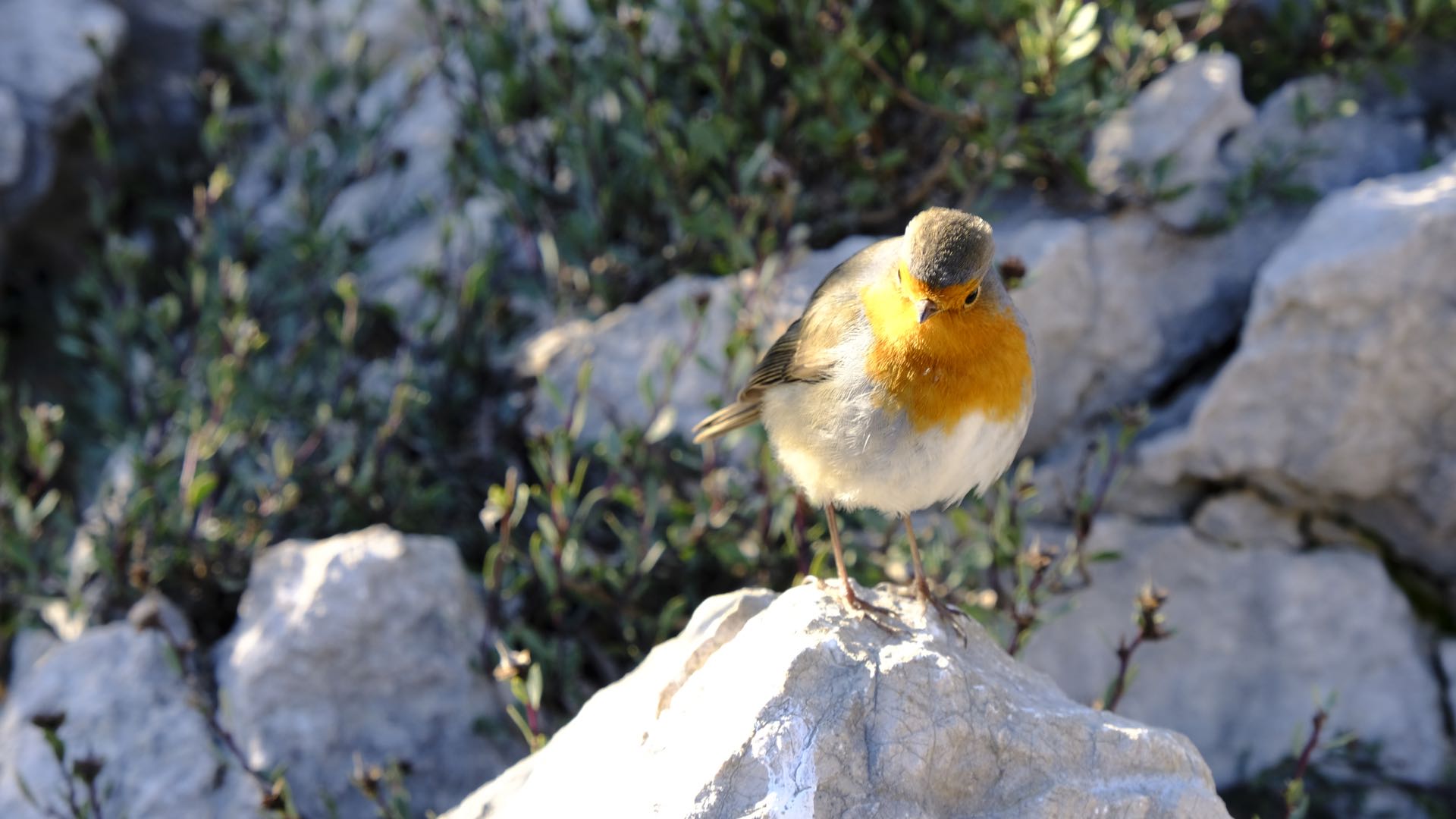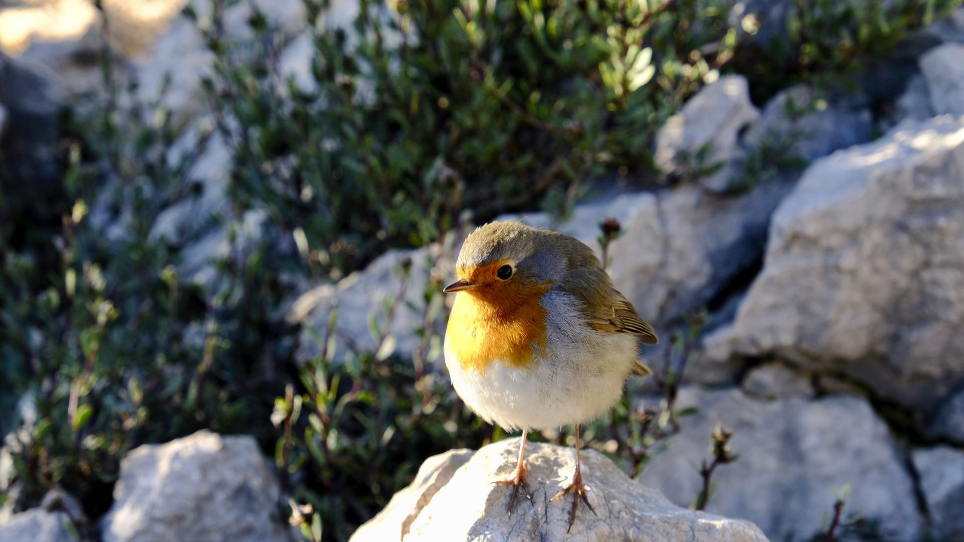 One day in mid January, a Robin visited me when I was viewing the Sugiton mountain range in the Calanques of Marseille. I tried not to move so it would not fly away, but after some time I realised it was not afraid at all. I squatted to come closer to this lovely bird. It stayed around me for about ten minutes and then flew away, not to be seen again, but leaving a vivid impression behind.