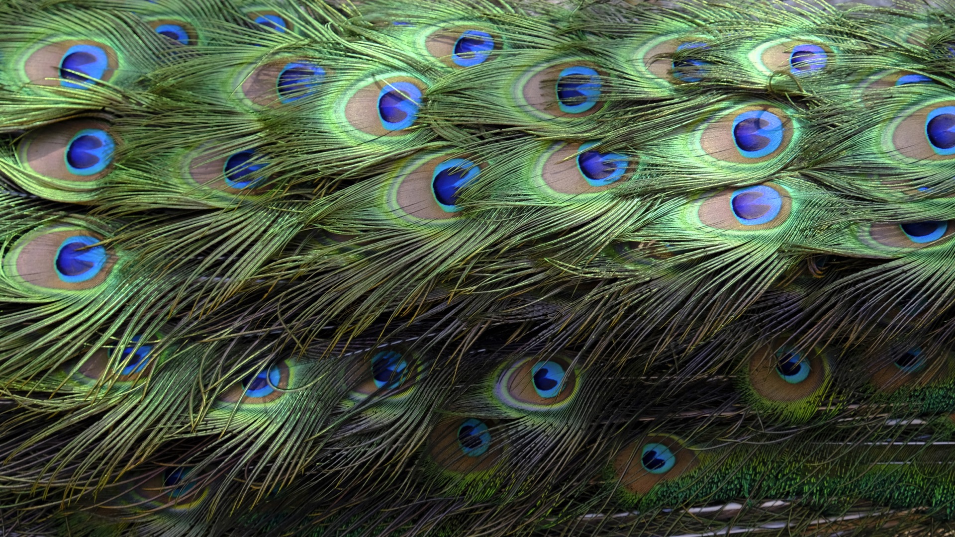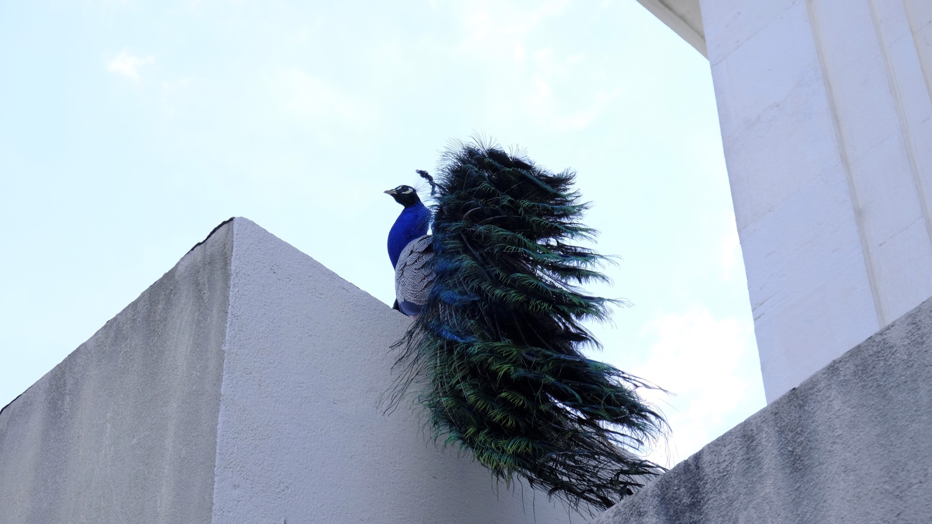 It came from the building near me. I saw the white-blue head of the peacock sticking out above the balcony wall. It seemed a safe place for the conspicuous animal. Occasionally, it showed its full tail, turning around with it, and then hopped on a wall higher up.
