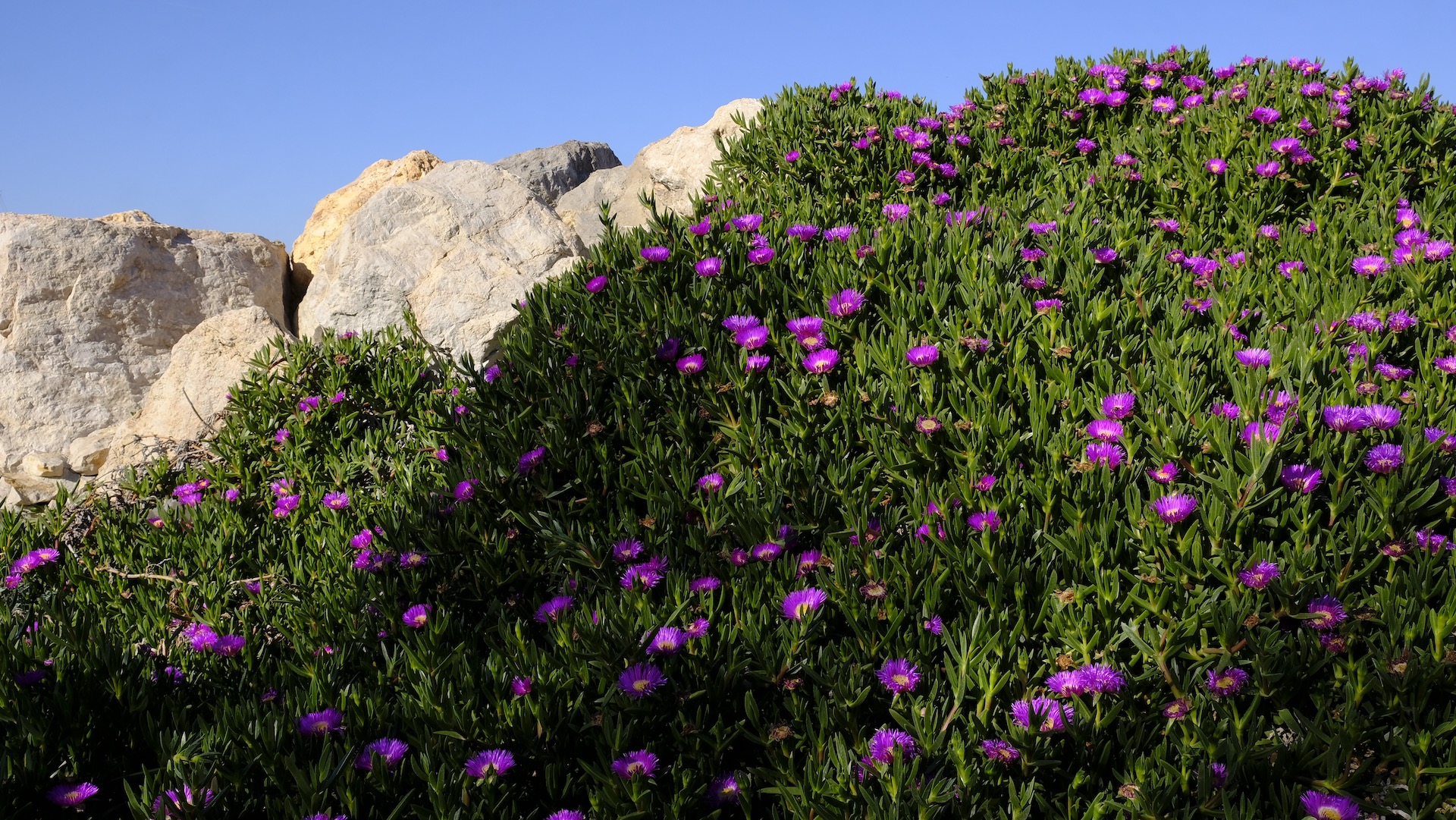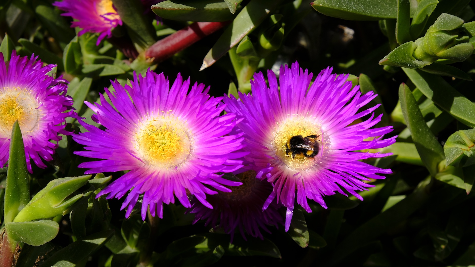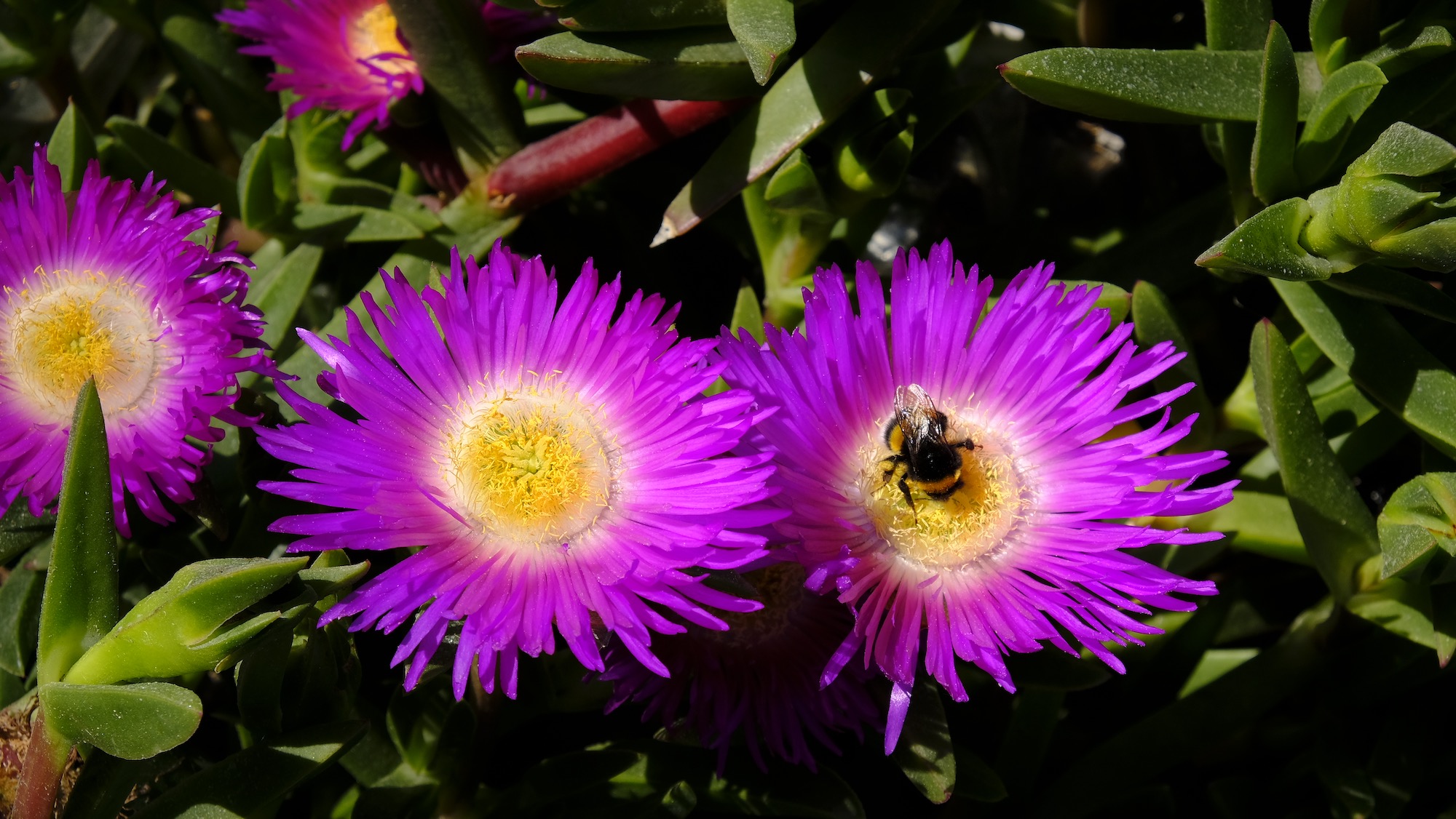It is late winter but it feels and looks like early Spring. And we know it. In spite of the coronavirus pandemic it feels better to go outdoors than staying indoors. When viewing the activities on the sea, I noticed this beautiful ice plant growing over some boulders, enthusiastically visited by bumblebees.