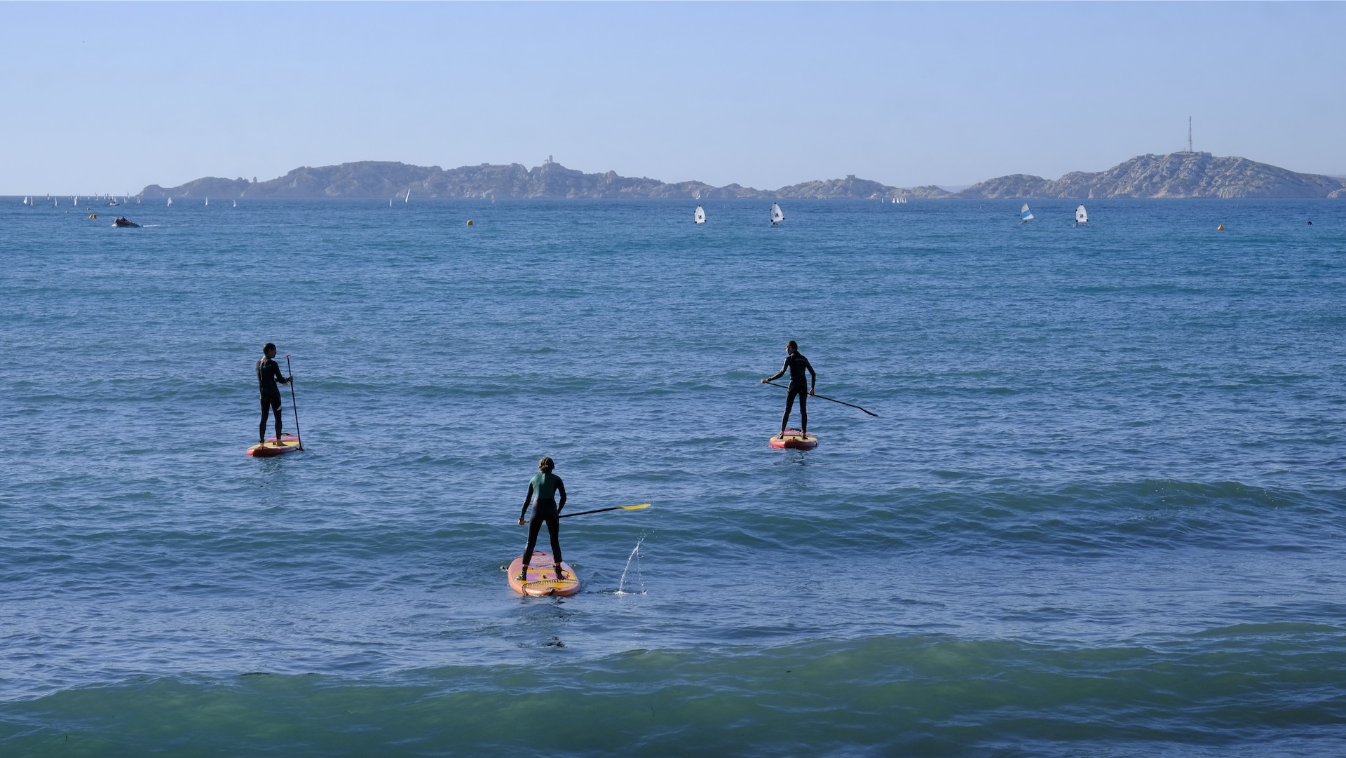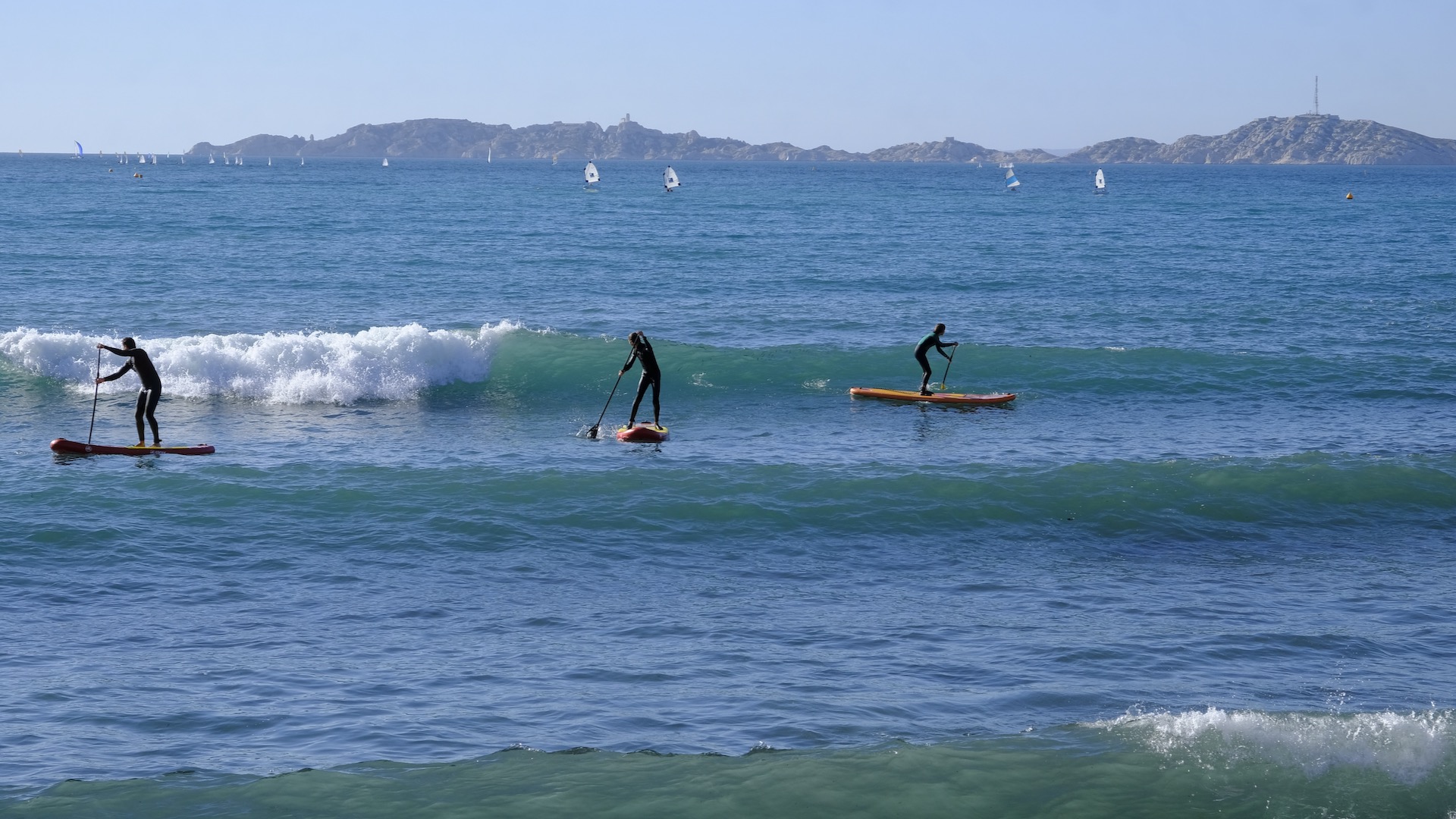 It looks that the surfboard used with a sail is also used as a platform for paddling. Either way, it is all about keeping balance when facing wind and waves. Surf teachers in motorboats keep an eye on those who lose balance and fall into the sea.
