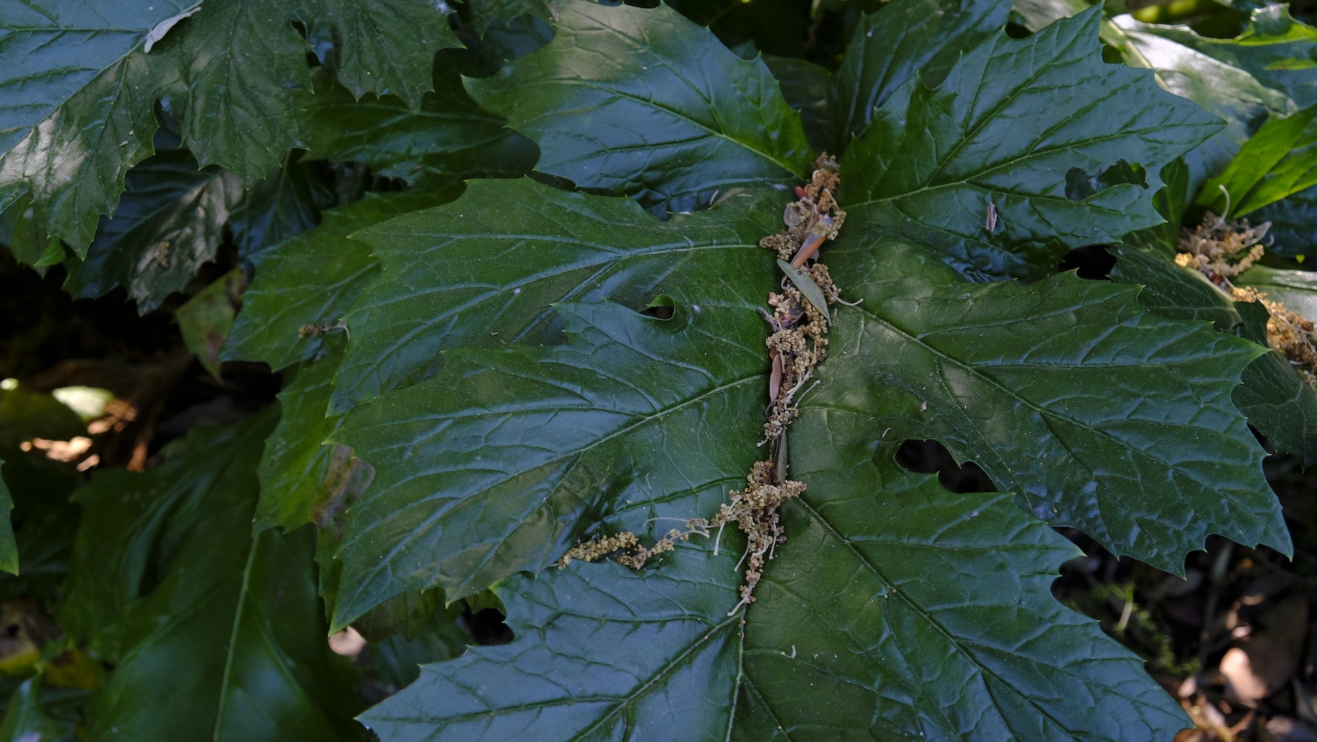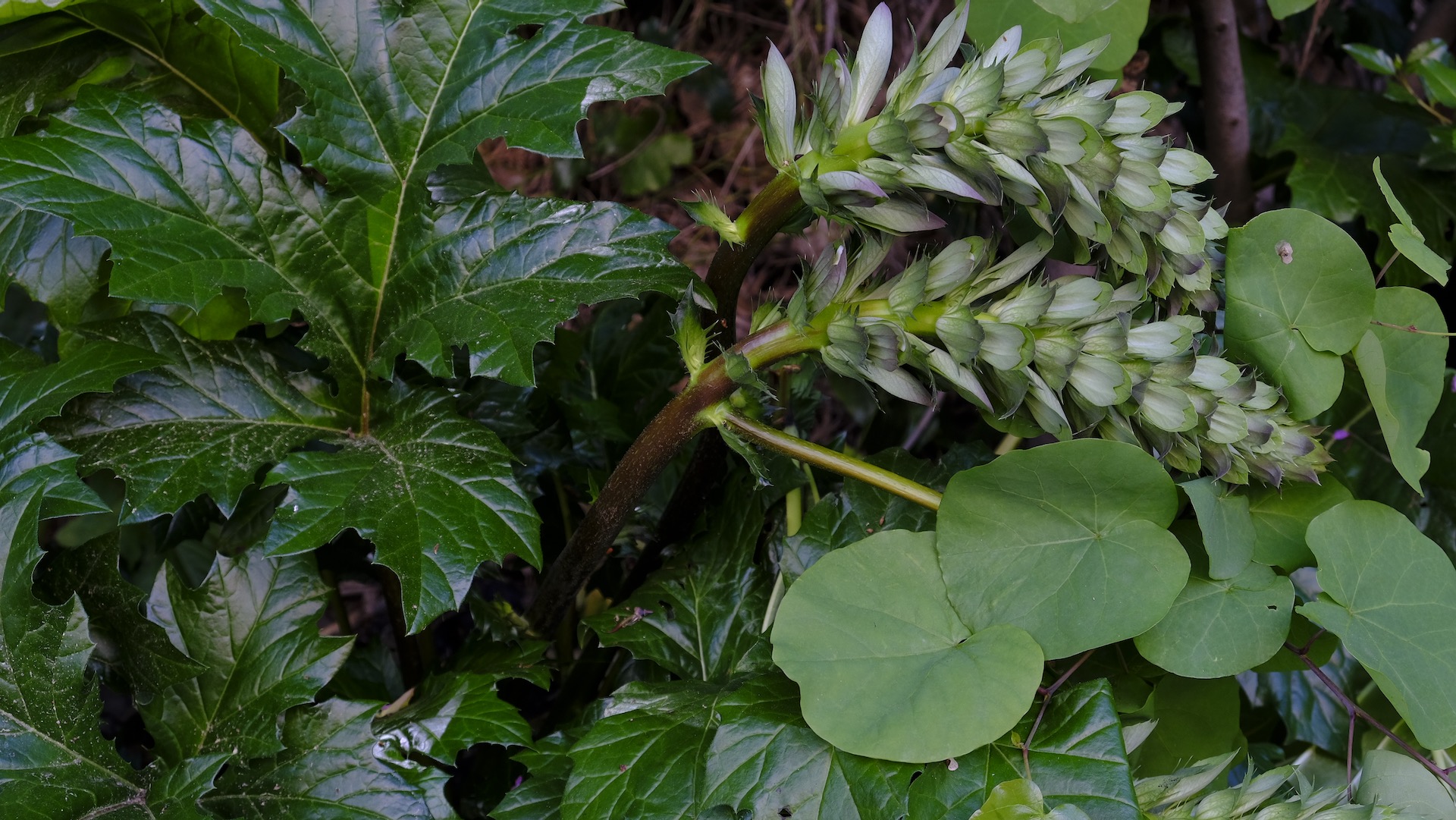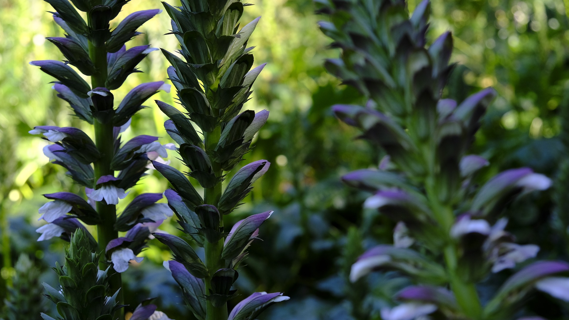 Wild green parakeets could be heard when I noticed one of my favorite plants. The Acanthus mollis. This plant or flower does not have a real name and so I call it by its Latin label. Acanthus refers to the prickly bract that holds the flower, and mollis means gentle. A gentle prickly bract. It is the towering flower spikes and the large ornamental leaves that make this plant exceptional.
