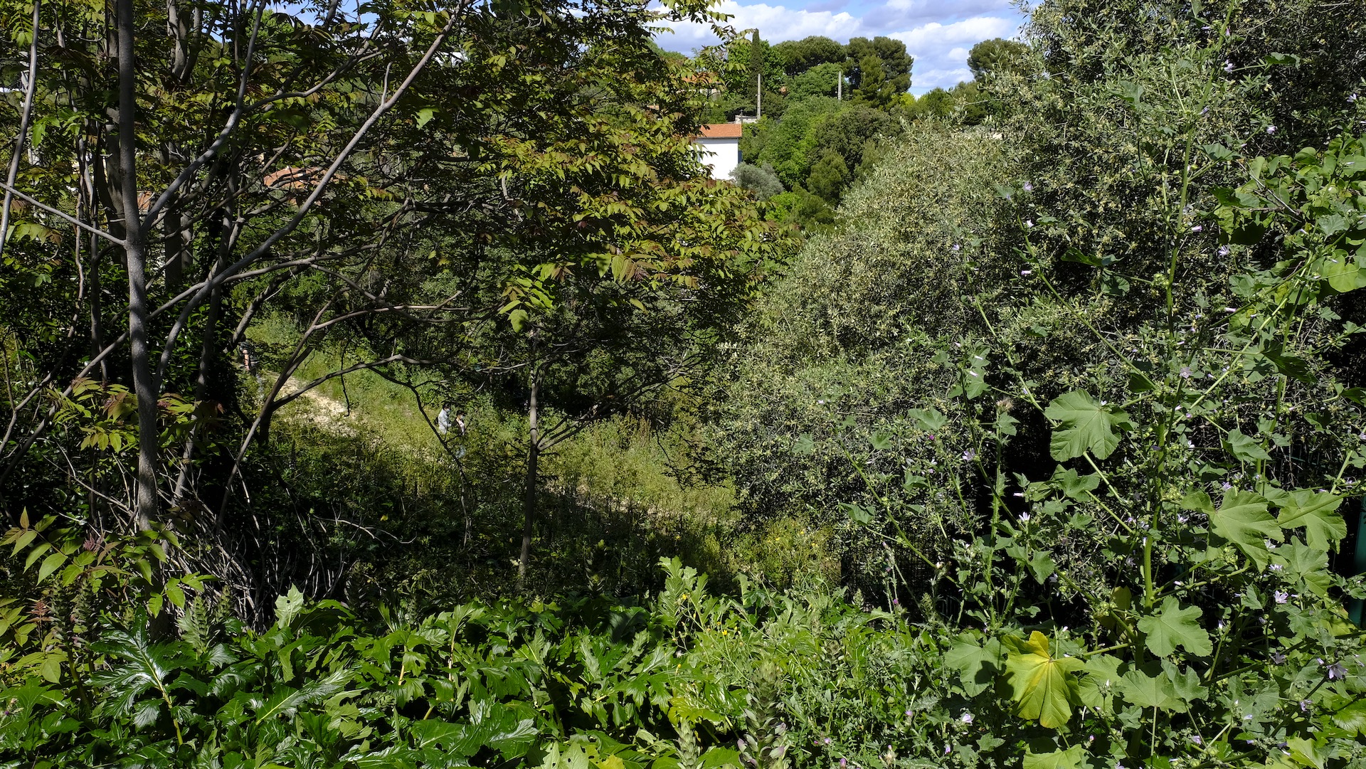 Deciding to turn back as I had almost reached the end of the street, I noticed a narrow path behind two low walls. It looked like a passage bordered by man tall weeds. Curious to know where it would lead to and if interesting flora and fauna could be found, I entered the path.