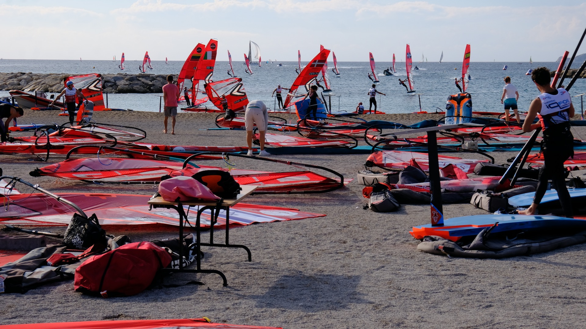 On the last day of the iQFoil Windsurfing European Championships I went to the coast to watch the final medal race. The race was held far off the coast making the surfers appear like tiny poles on the horizon. When it was over, they all returned to their base and began cleaning and packing their boards and sails. The French won the gold medals for both men and women. They will participate in the Olympics 2024 that will be held in Paris.