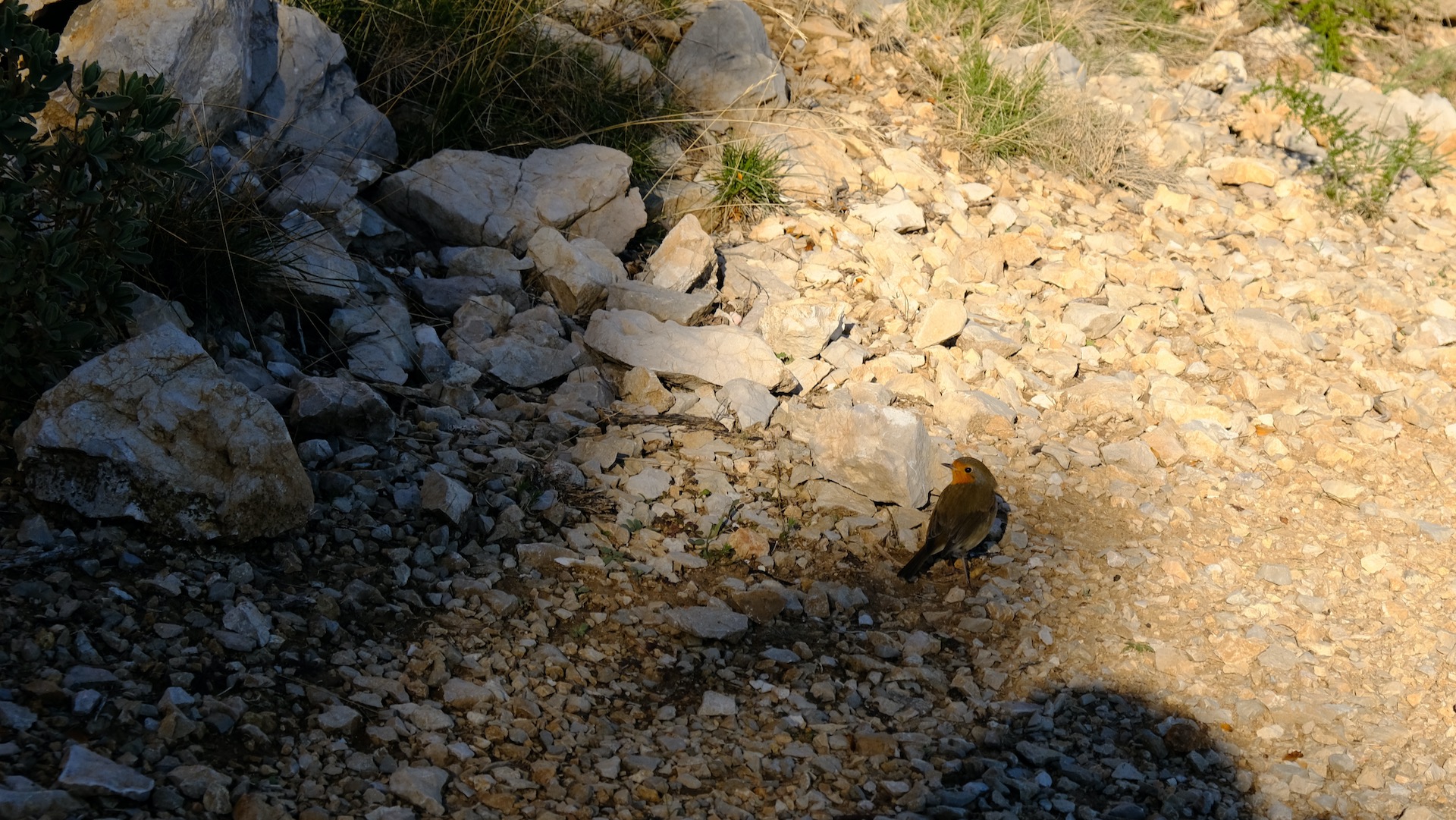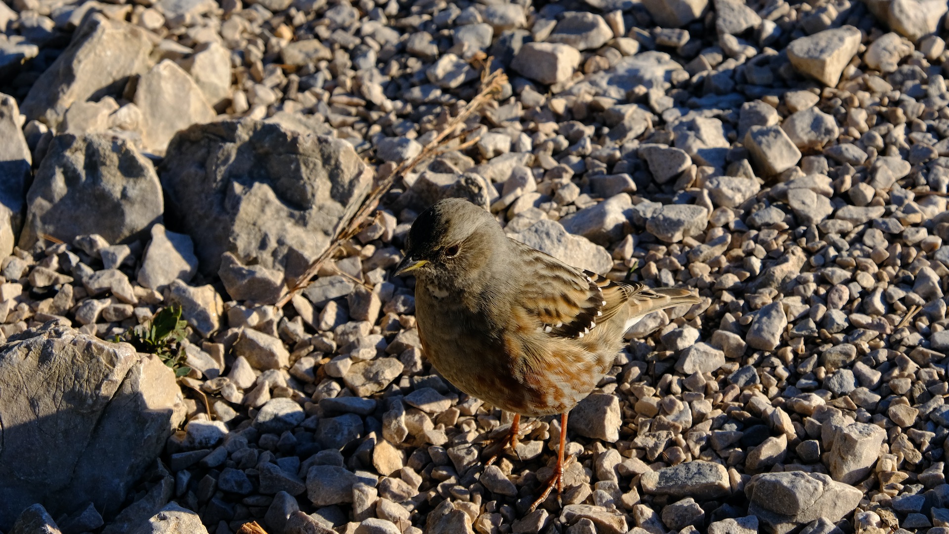 Visiting a specific spot in the Calanques, I was hoping to see the Alpine Accentor, the one who sings with another. While sitting and resting against a rock, the bird suddenly appeared. It came close to me as if giving his greeting. I was touched. It was no trouble following him as it seemed to be at ease with my presence. I spent quite some time, observing, and wondering how this bird could find tiny edible pieces between those tiny rock pebbles. And then .. it was gone.