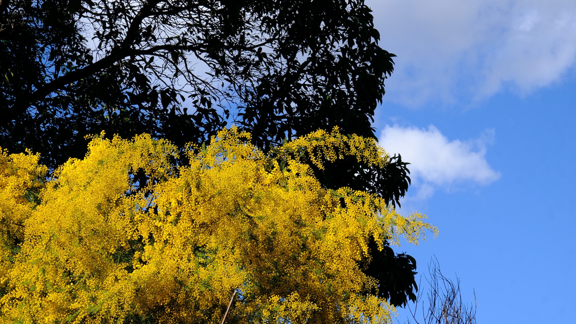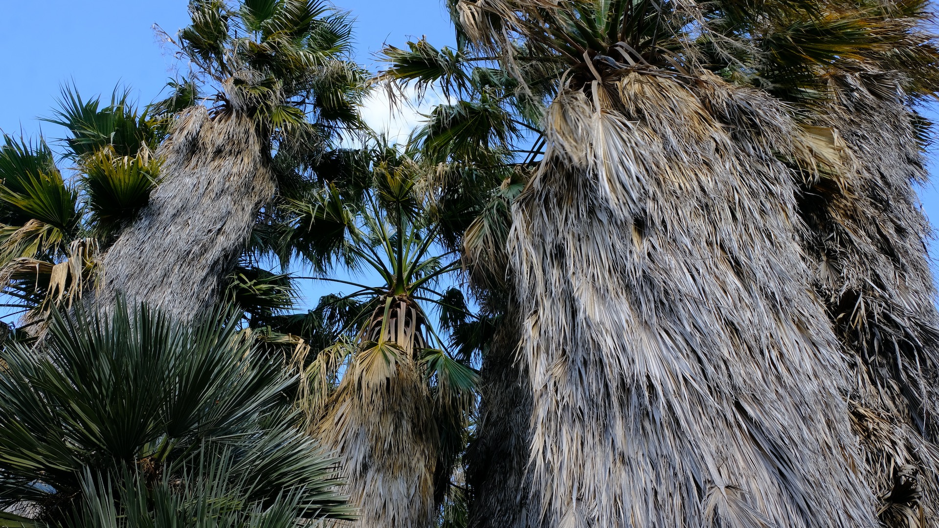 The Mimosa is also called ‘ray of sunlight’ for its long twigs holding tiny yellow ball-like flowers that shine like little suns. They are the sunshine in winter time as their abundant bouquet lights up the area where they grow. When I see tall palm trees with their trunks covered by old leaves, it must be to protect themselves against sun, rain and animals instead of dropping their leaves. They also look majestic that way.