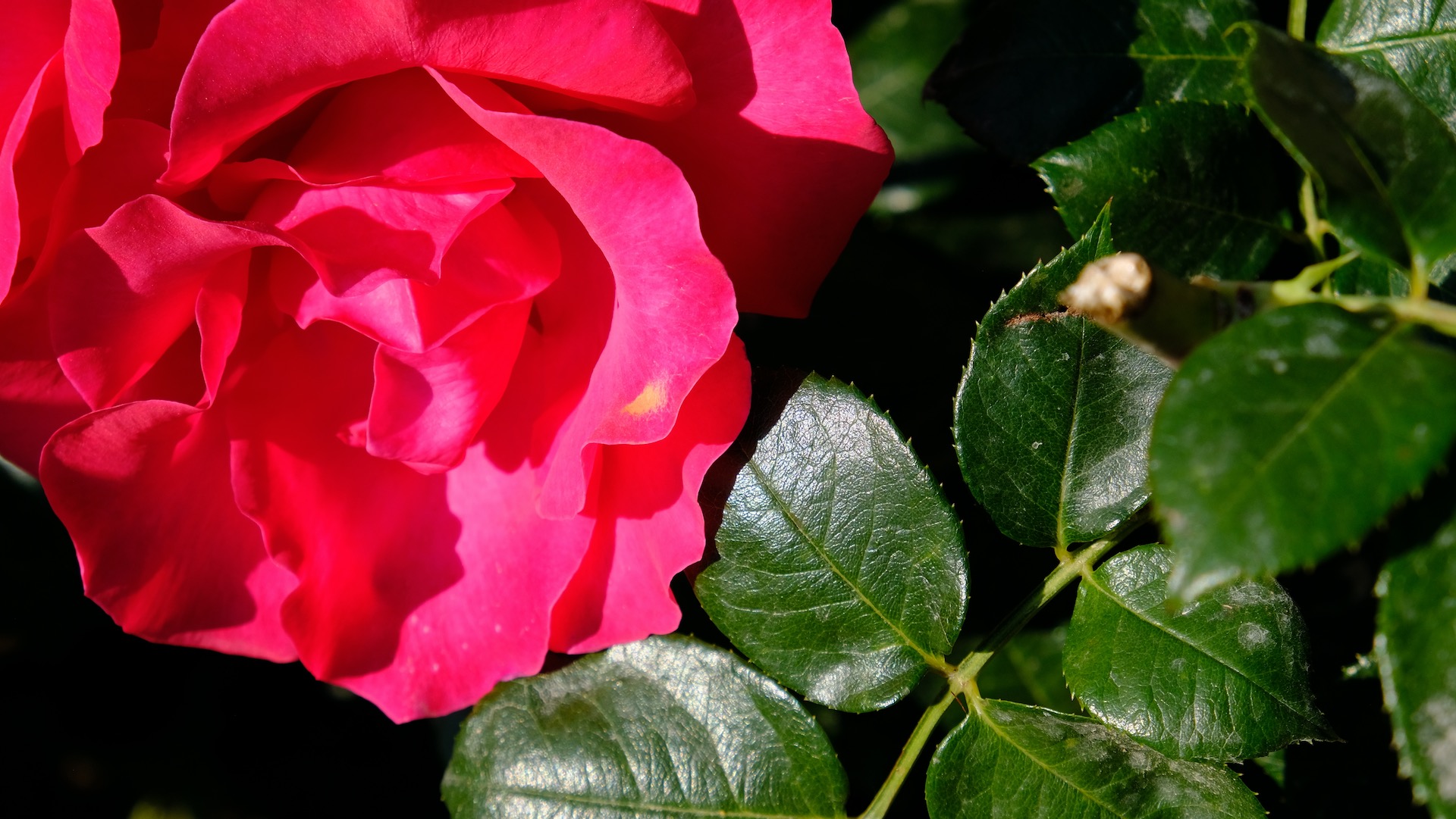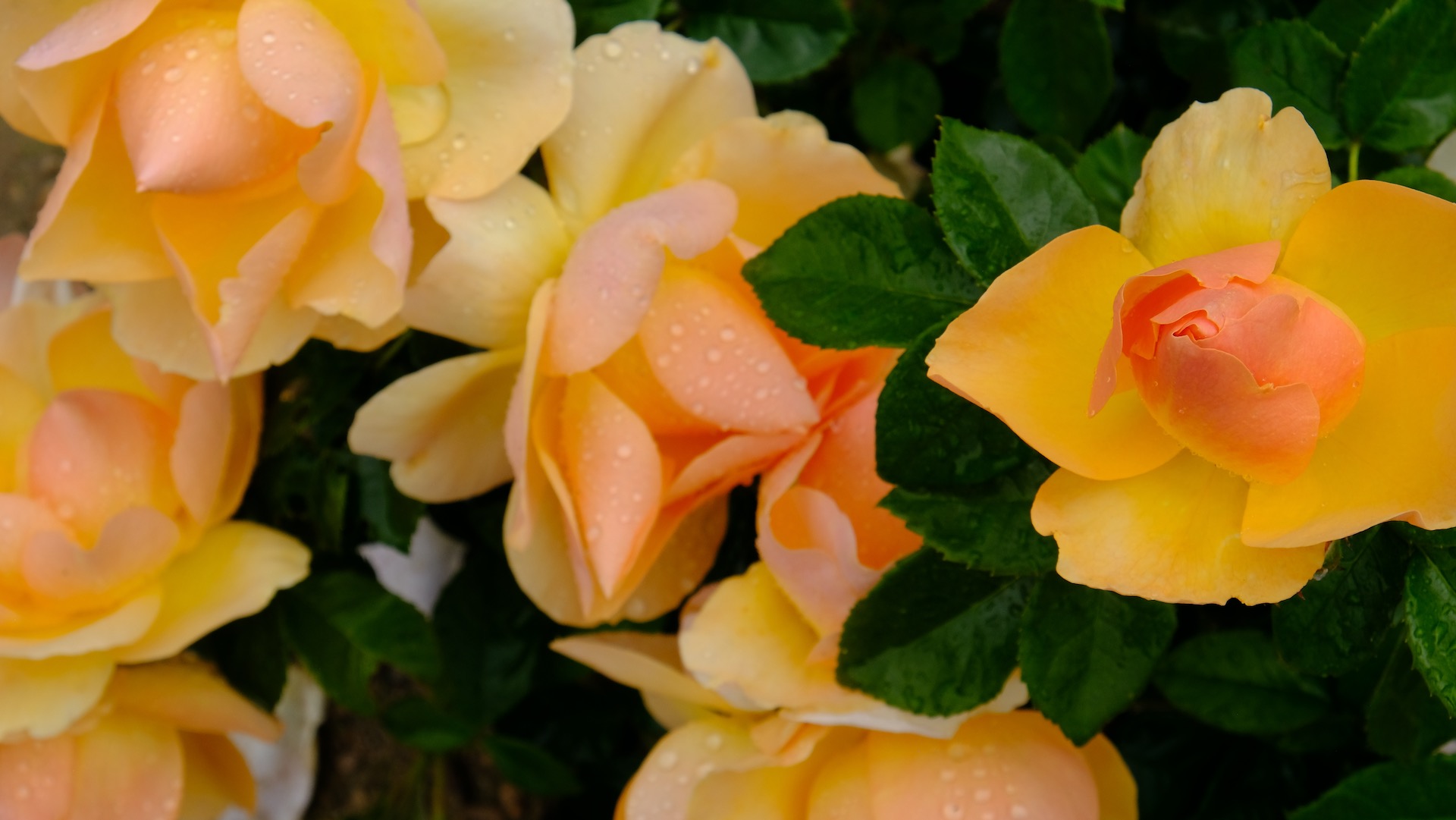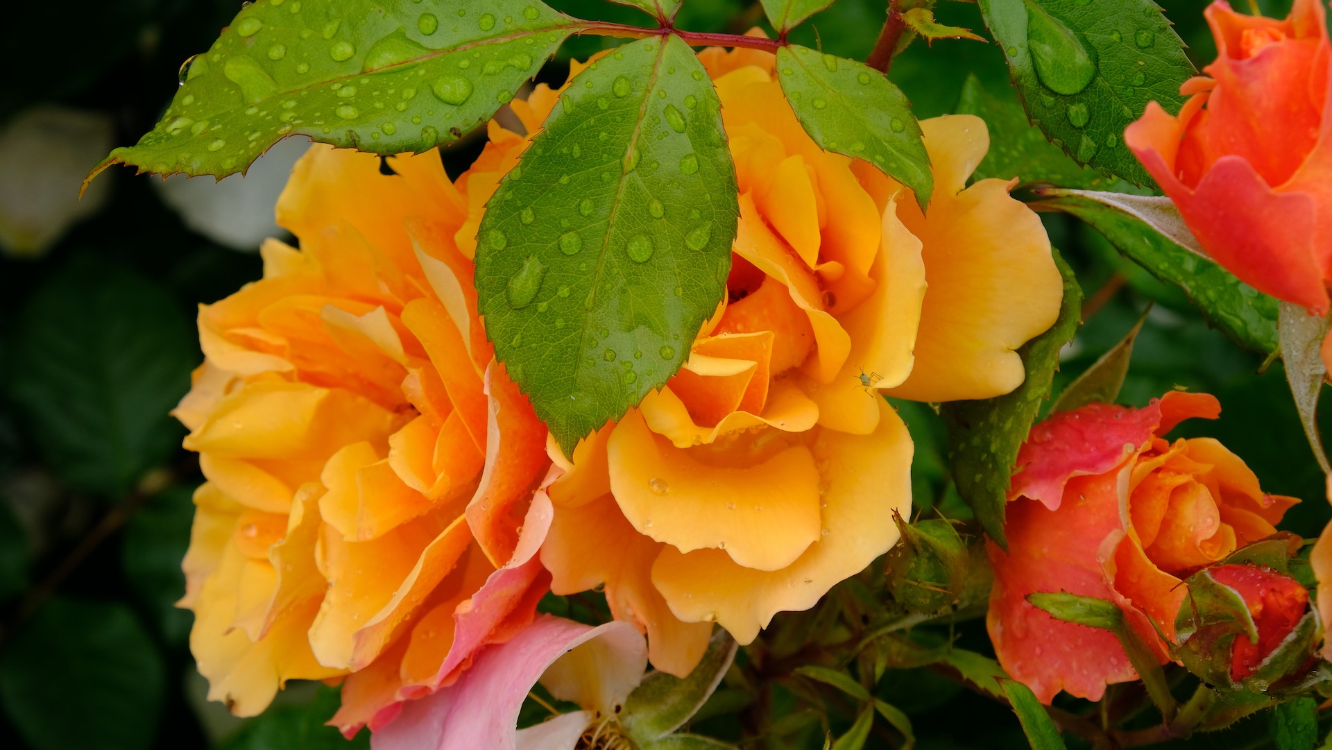 Mostly I prefer a ray of sunlight shining on a subject but on the day when photography friend Faty (Fatima) joins me to visit the rose garden it begins to rain. Wearing a raincoat, she starts taking photos right away while I, raincoatless, wait under the generous green branches of trees until the rain stops. Raindrops on rose petals, that’s different.