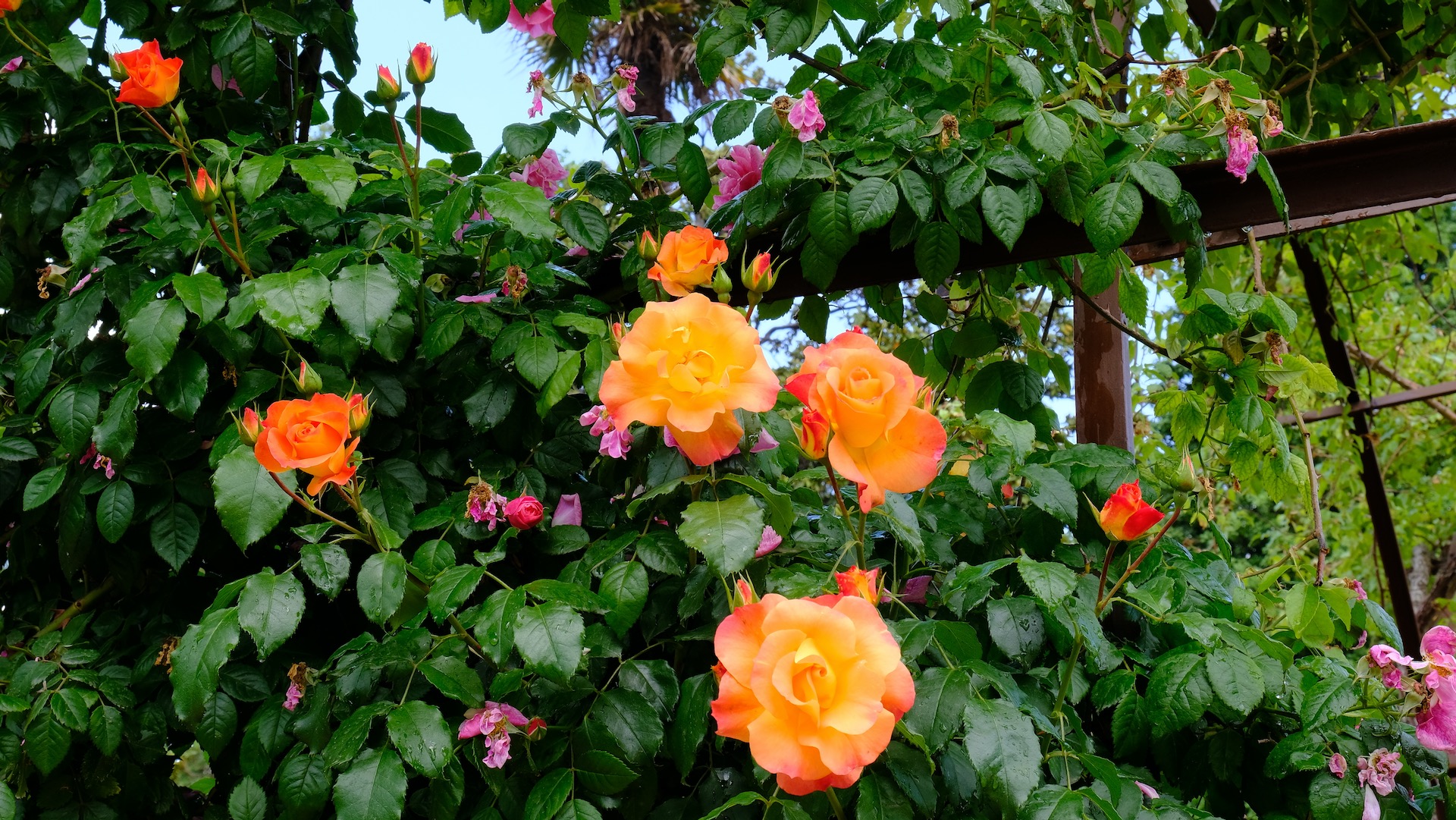 This month with on and off rain and sun makes for a varied display of rose colors and green leaves, dry or humid, dull or bright. Nevertheless, in this dry Mediterranean climate roses wither quickly. For seeing fresh flowers one needs to take the time and return to the spot.