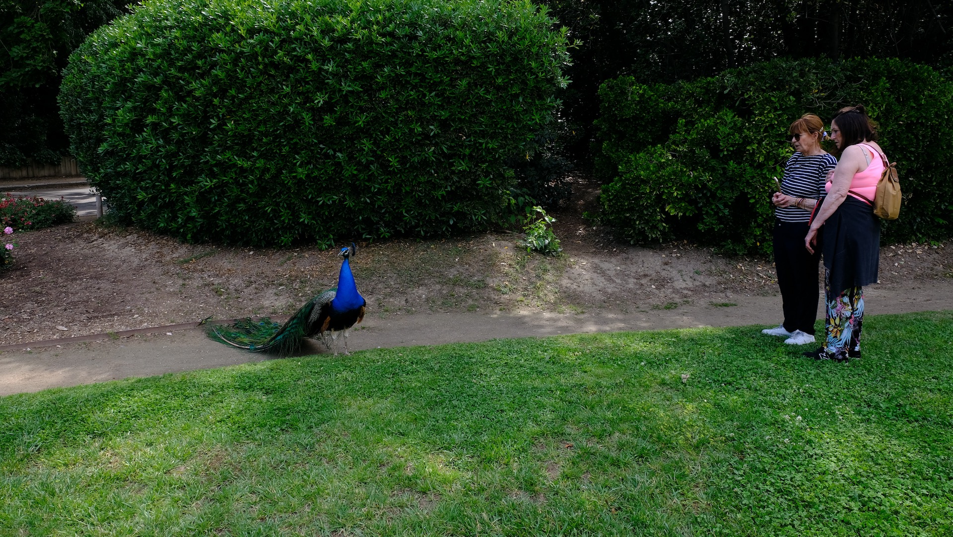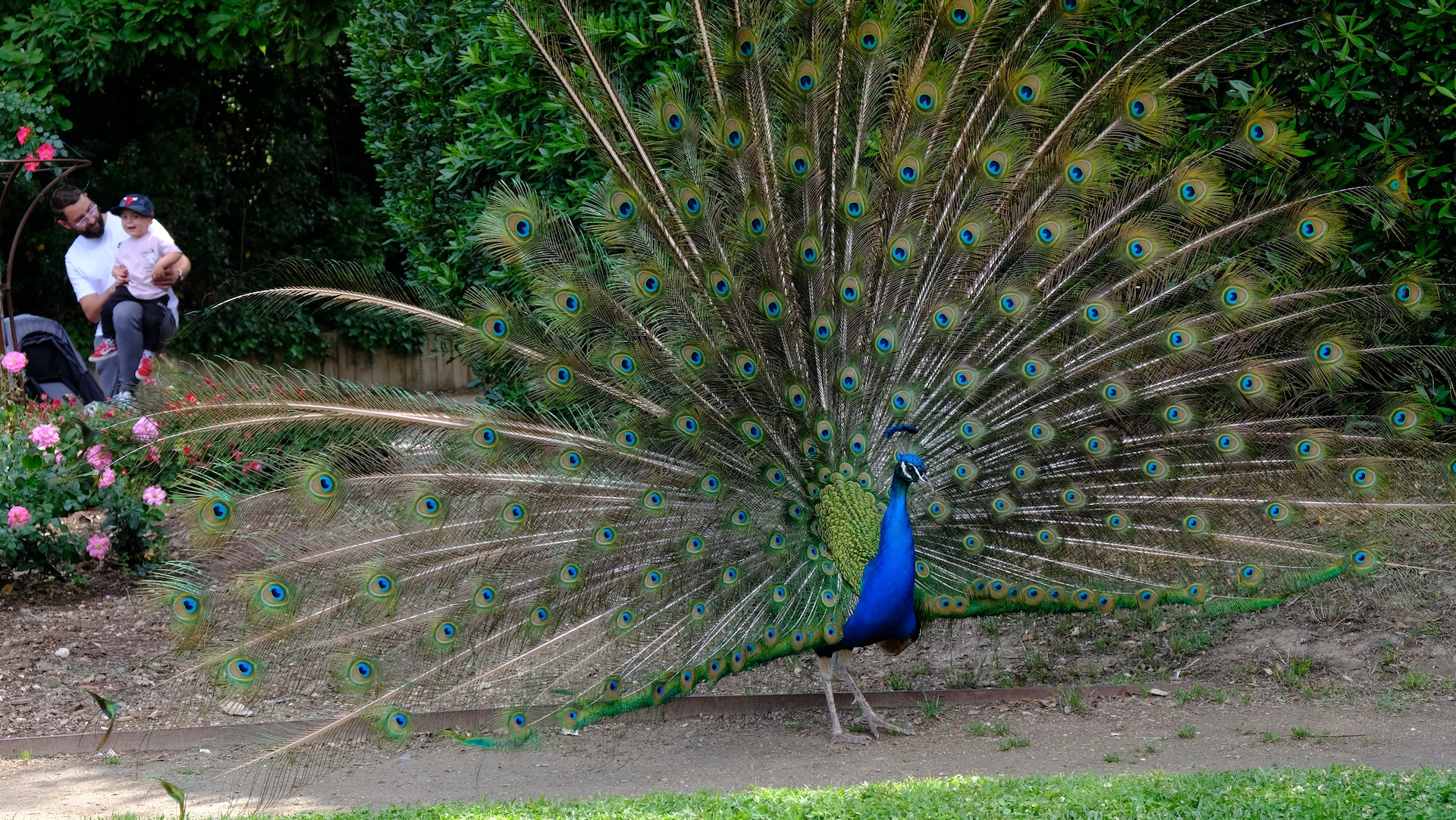 As the peacock moves on – so do the people. Seeing this individual bird making contact and conduct a show for another species is striking. A public park with plenty of daily admirers must be the inspiration for his bold solo act. It falls under performing arts, this time complementing the special celebration of the rose garden, we agree.