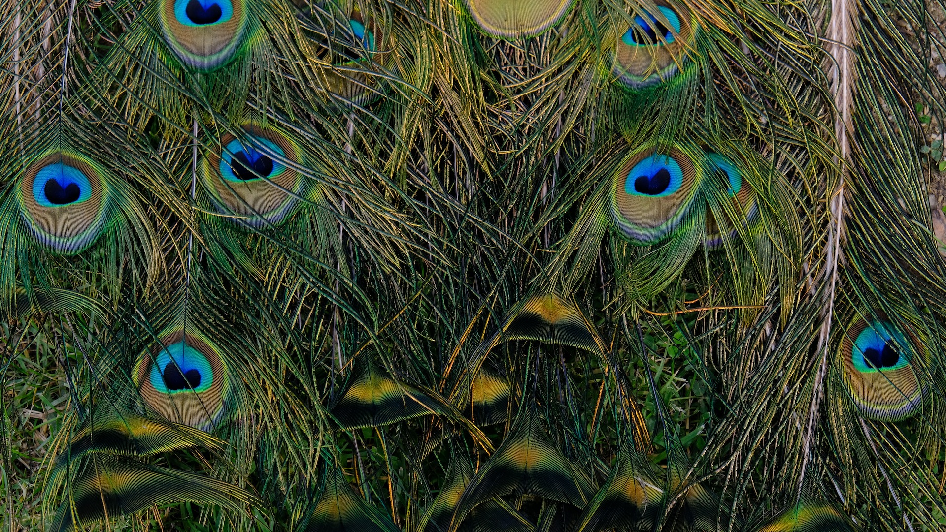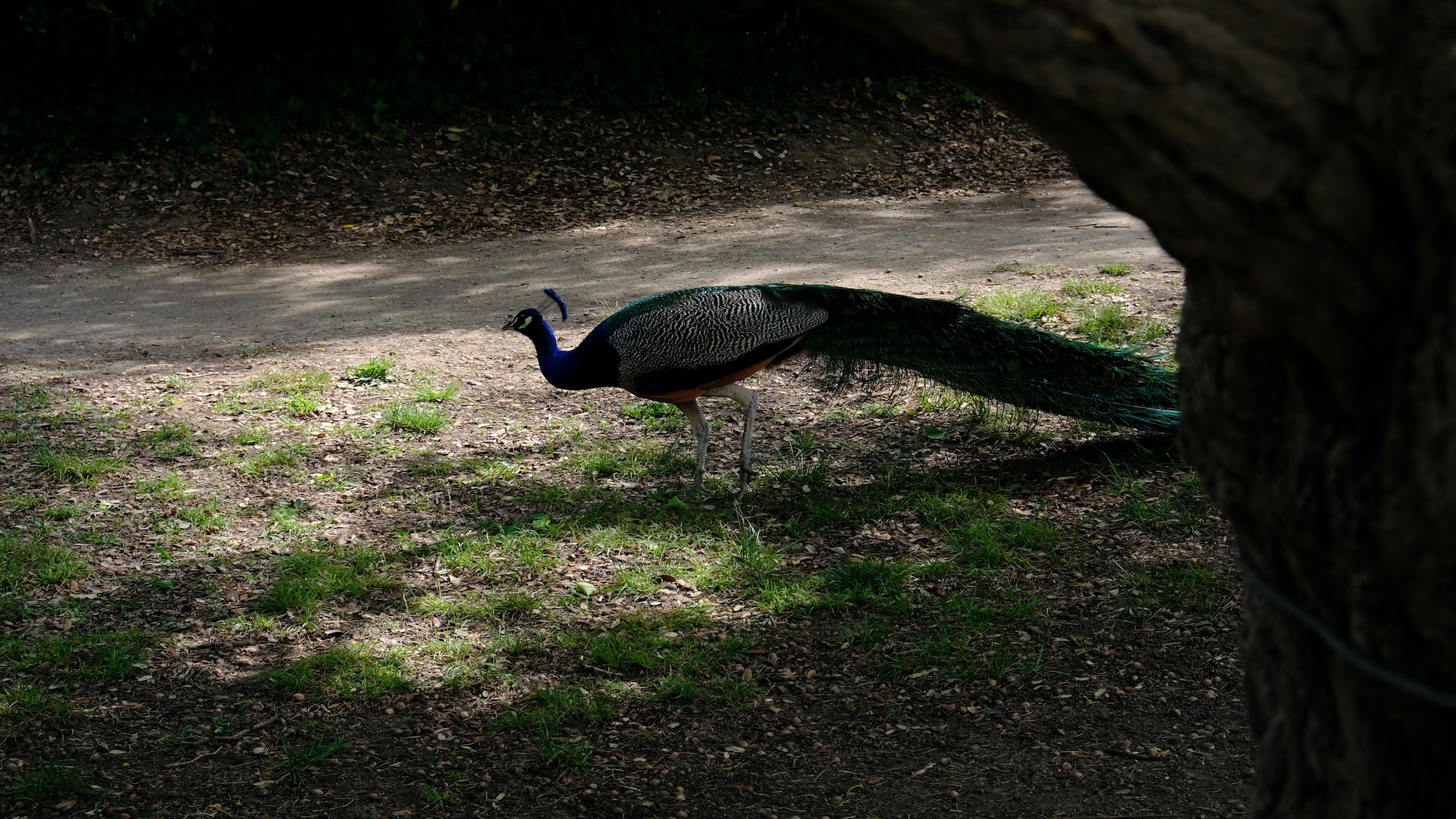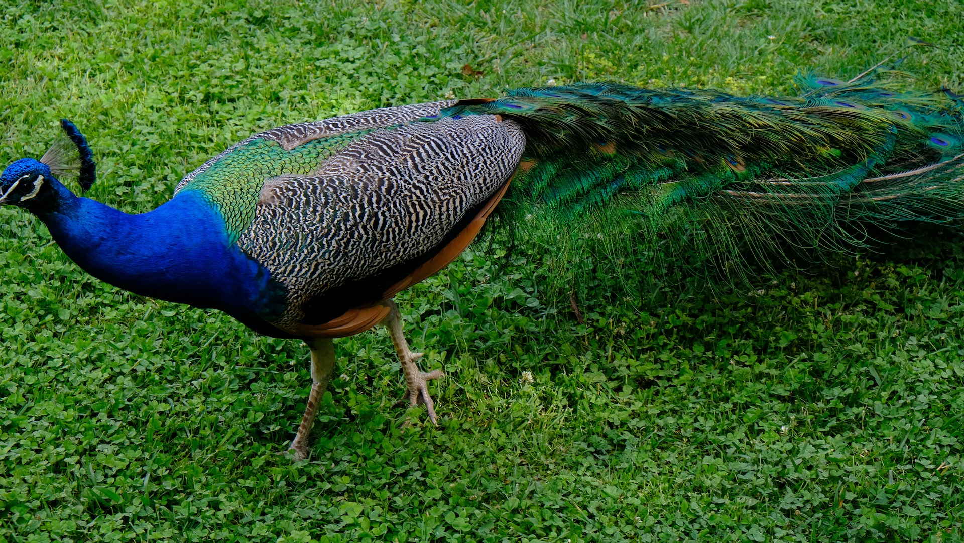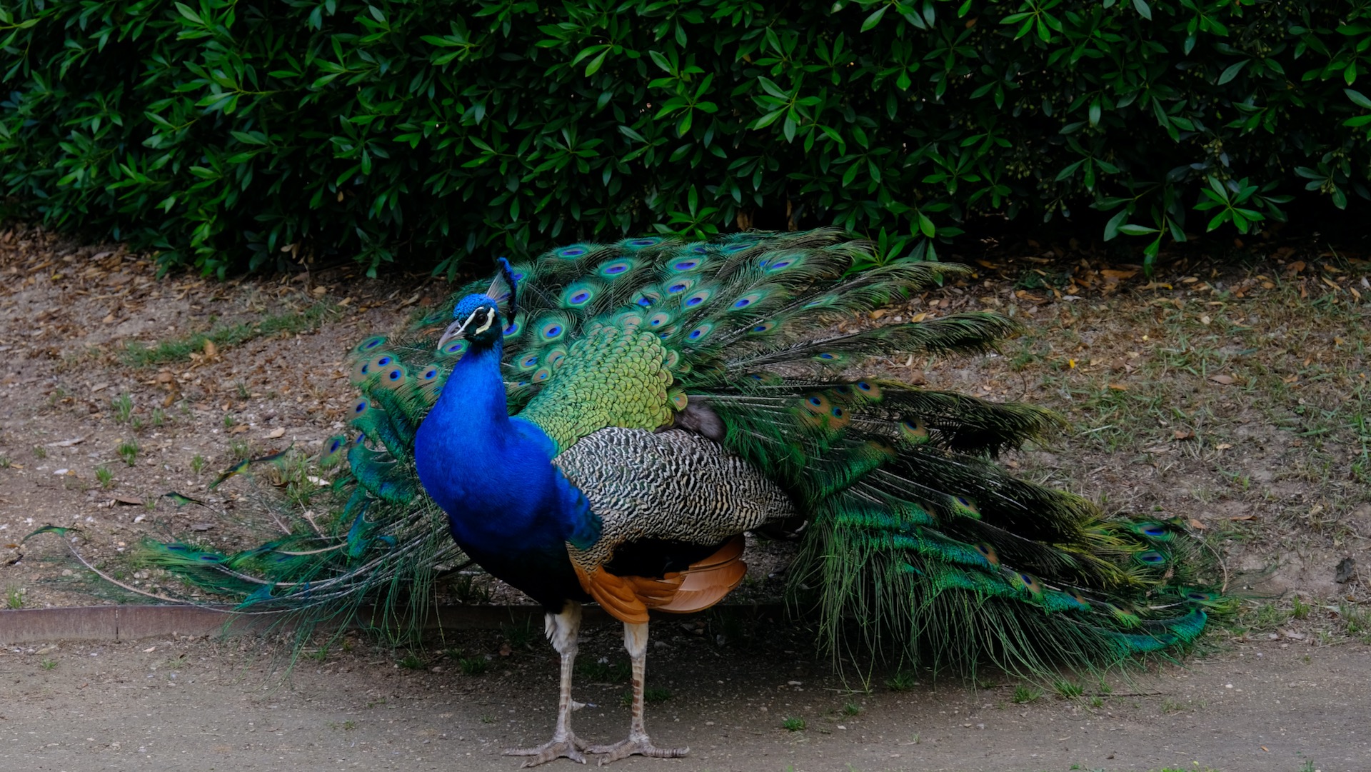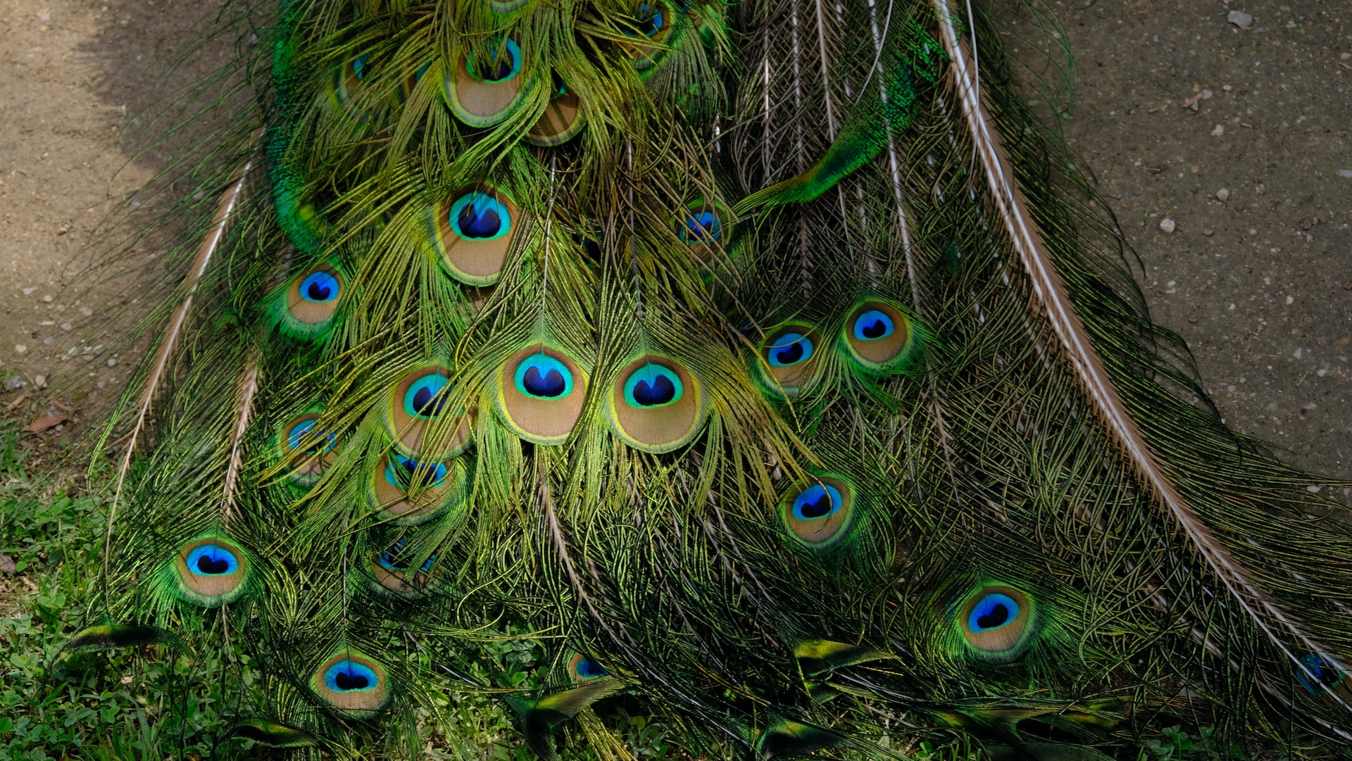 The peacock performs. He decides how long the tail will be held up and how much time people can spend on admiring his personal grandeur. When taking photos of the tail he poses, until .. he has enough of it and with long steps moves on. He is master of his spectacle.