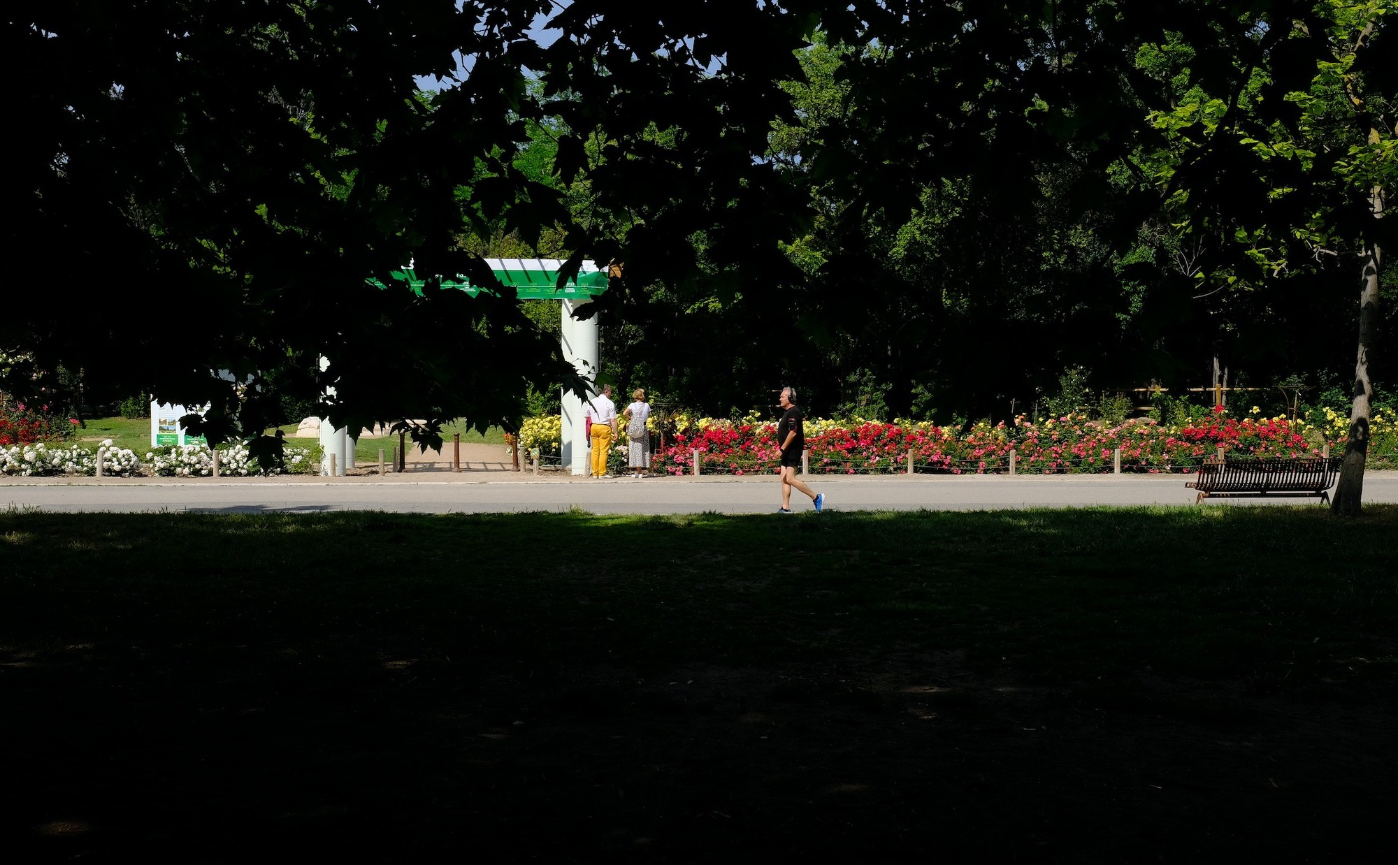 Mostly I prefer a ray of sunlight shining on a subject but on the day when photography friend Faty (Fatima) joins me to visit the rose garden it begins to rain. Wearing a raincoat, she starts taking photos right away while I, raincoatless, wait under the generous green branches of trees until the rain stops. Raindrops on rose petals, that’s different.