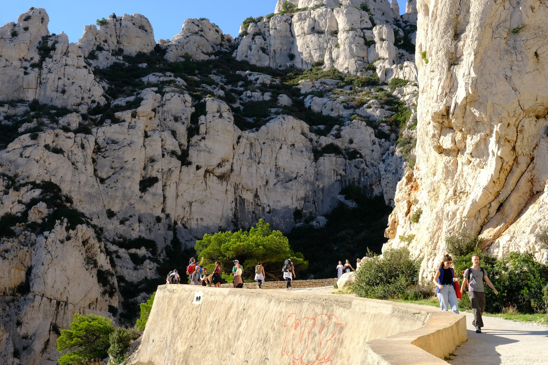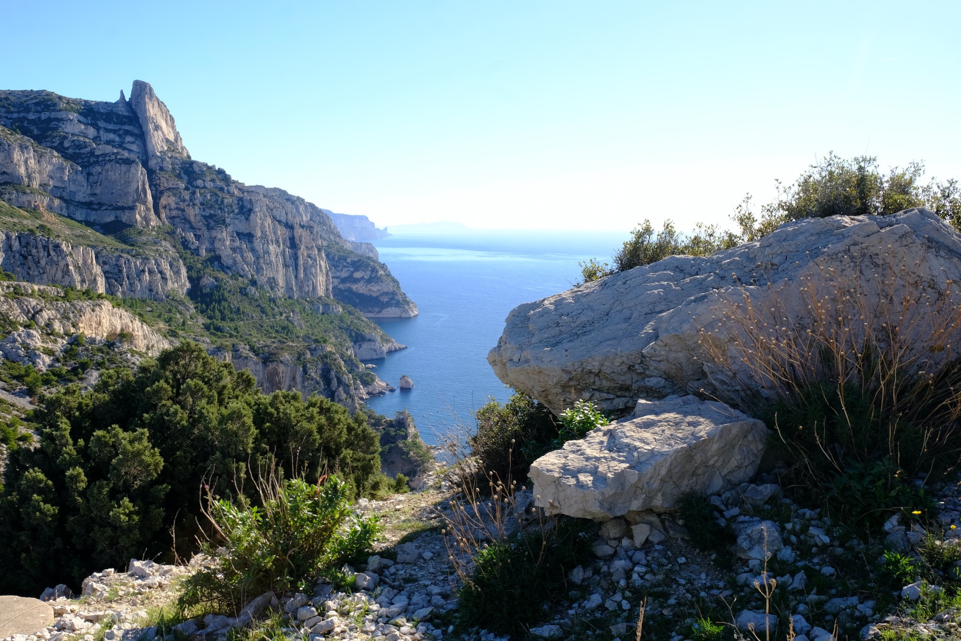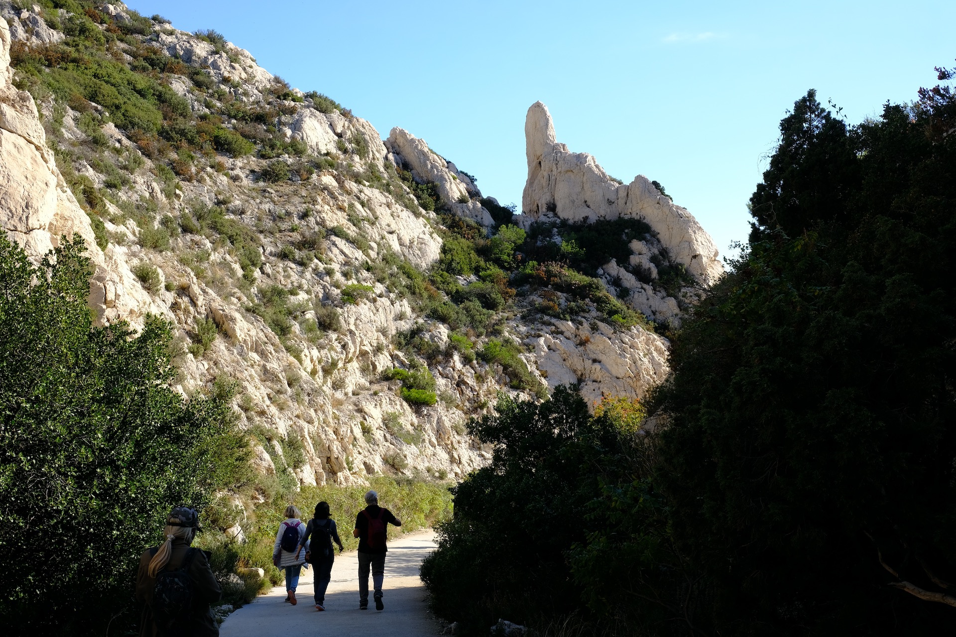 At a high point in the Calanques one looks on a continuing line of mountains along a pristine blue sea and often on a pristine blue sky that is known as Mediterranean blue. The deep view down inspires to want to get to the water. On a Sunday morning, my photography friend Faty and I decide to go down that long path to get a closer look of that site of the Calanques. Many people have the same idea, afterall, it’s Sunday.
