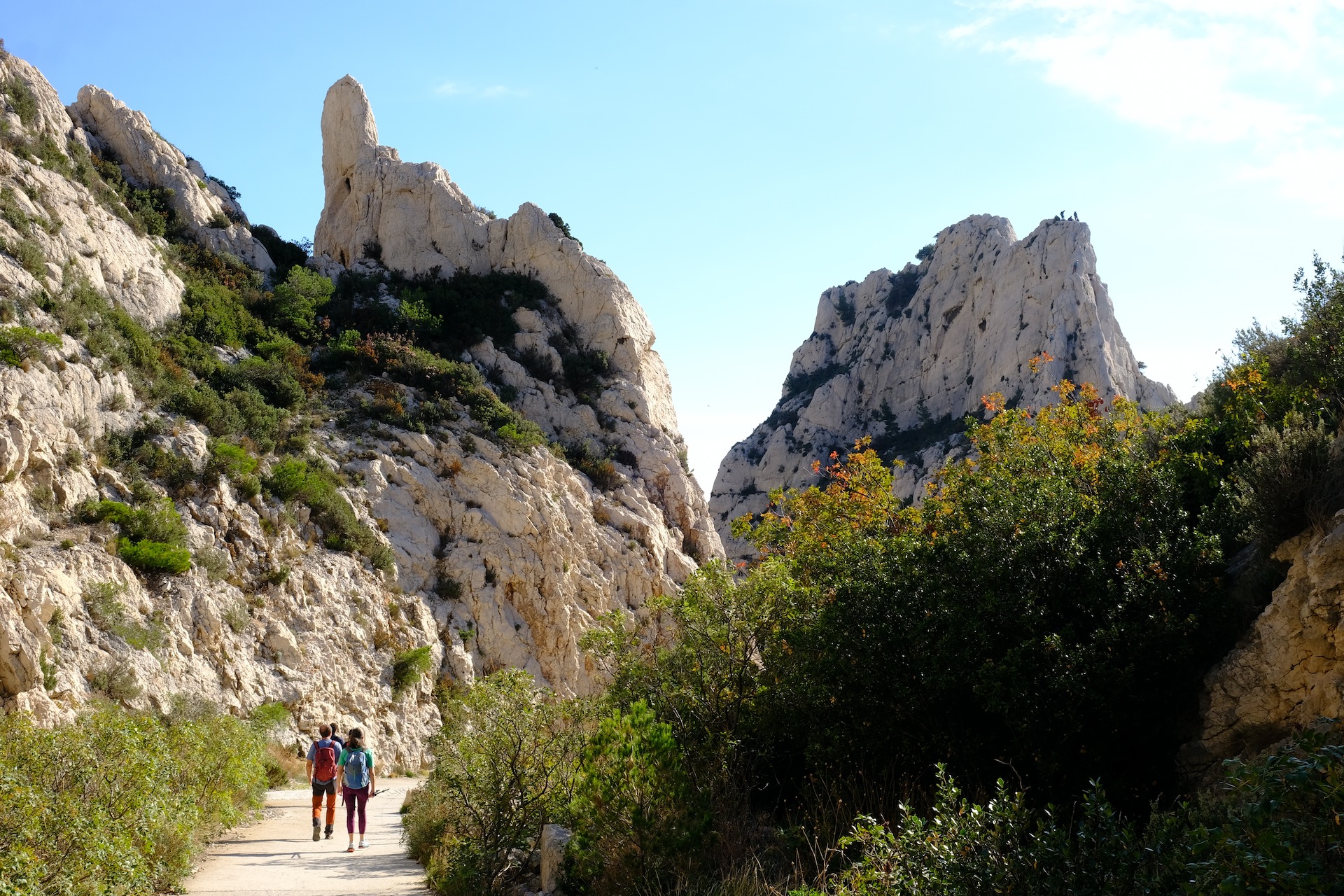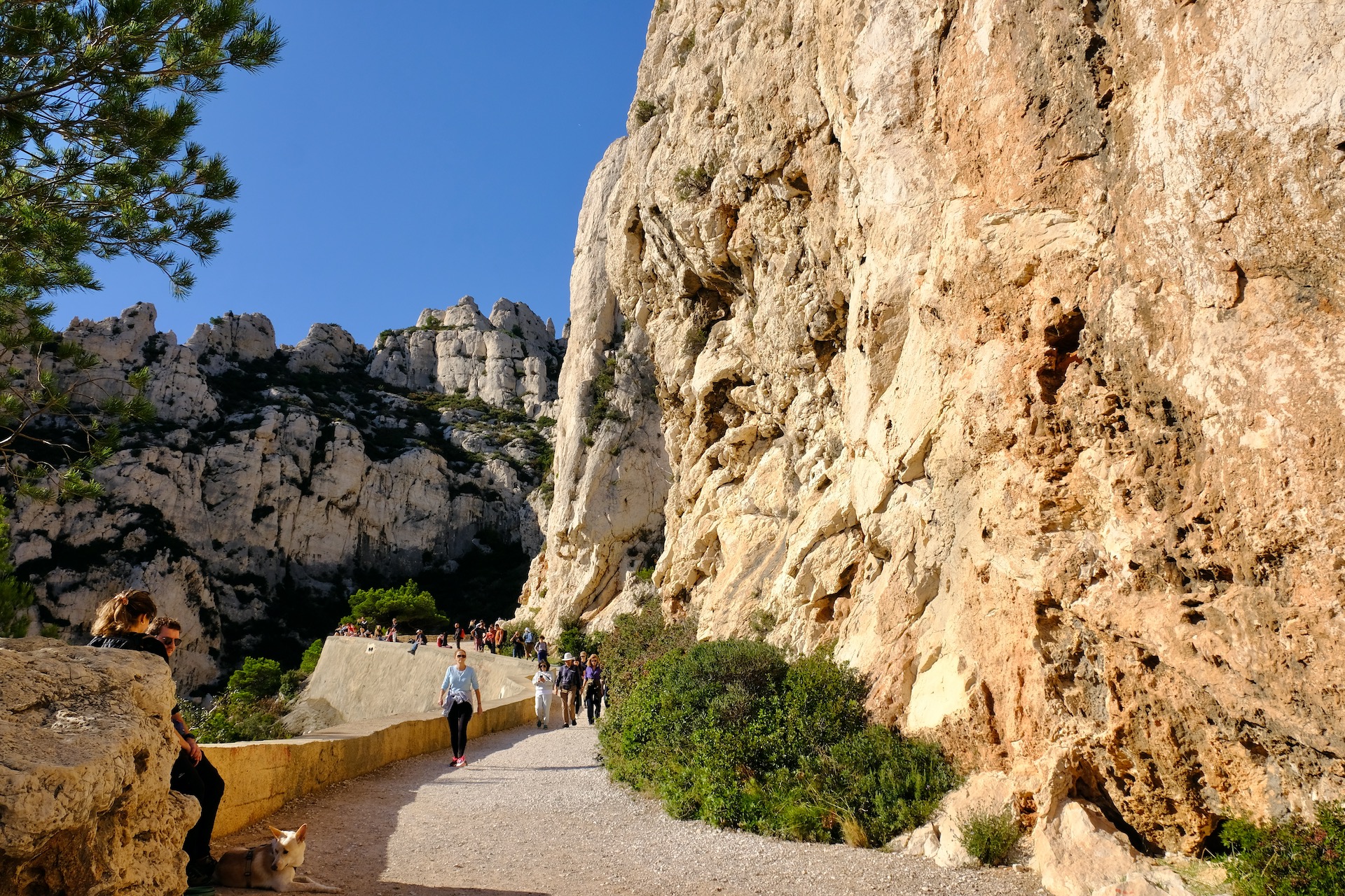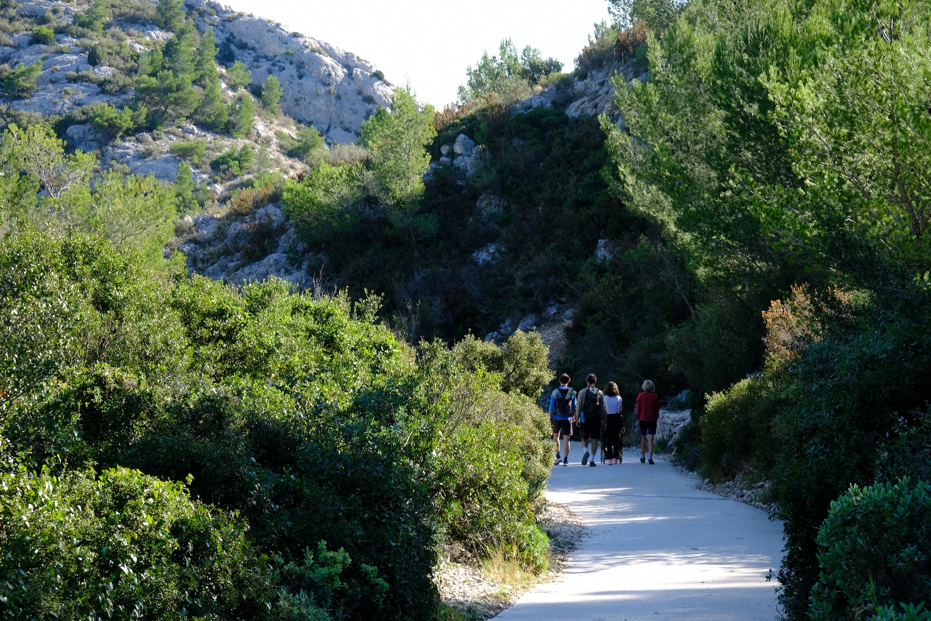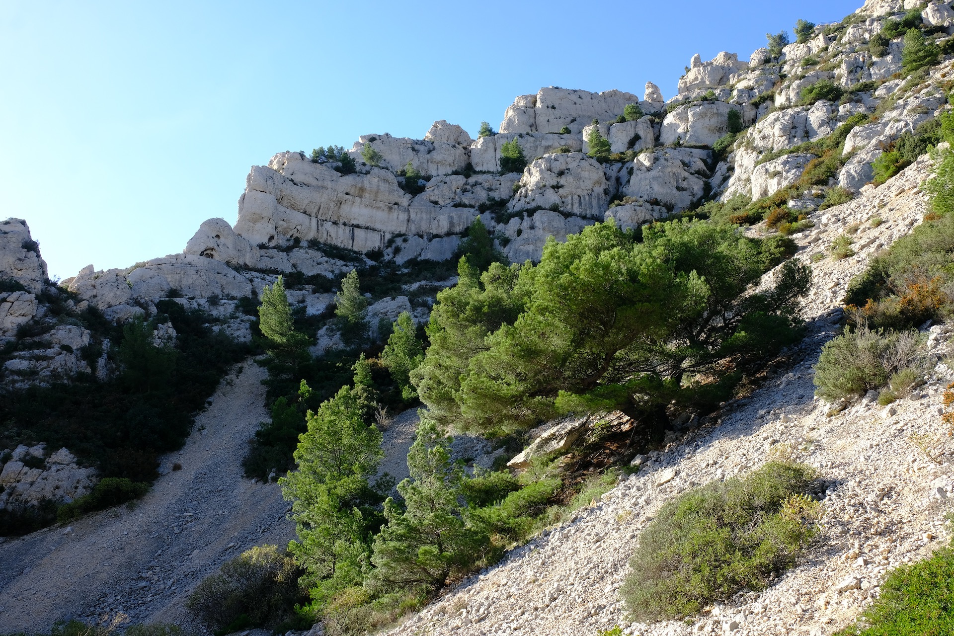 At a high point in the Calanques one looks on a continuing line of mountains along a pristine blue sea and often on a pristine blue sky that is known as Mediterranean blue. The deep view down inspires to want to get to the water. On a Sunday morning, my photography friend Faty and I decide to go down that long path to get a closer look of that site of the Calanques. Many people have the same idea, afterall, it’s Sunday.